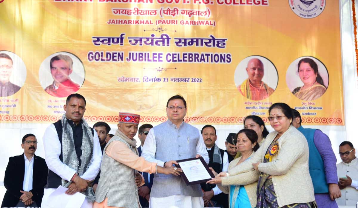 पौड़ी : माननीय मुख्यमंत्री श्री पुष्कर सिंह धामी जी द्वारा विधानसभा लैंसडौन के जयहरीखाल के भक्तदर्शन राजकीय स्नातकोत्तर महाविद्यालय के स्वर्ण जयंती समारोह में मुख्य अतिथि के रूप में प्रतिभाग करते हुए कार्यक्रम का शुभारंभ किया गया।मा. मुख्यमंत्री जी ने महान विभूति भक्त दर्शन जी को श्रद्धांजलि अर्पित करते हुए कहा कि उनकी भारतीय स्वतंत्रता में तथा उत्तराखंड राज्य के हित में महत्वपूर्ण भूमिका रही तथा उनको देश और समाज के लिए प्रेरणा स्रोत बताया।