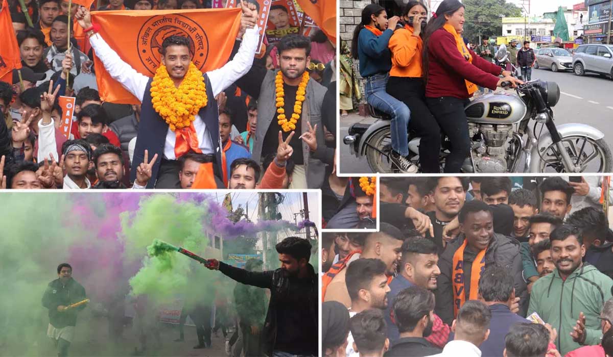 रैली में संगठन के समर्थक छात्र-छात्राओं ने अबीर.गुलाल उड़ाया और अध्यक्ष पद के दावेदार दयाल बिष्ट के पक्ष में जिंदाबाद के नारे लगाए।रैली में डीएवी कालेज से छात्र संघ चुनाव में अध्यक्ष पद के दावेदार दयाल बिष्ट के अलावा उपाध्यक्ष पद के उम्मीदवार वाशु वशिष्ट शर्मा,कोषाध्यक्ष के दावेदार विविधा चौहान,सहसचिव के दावेदार मान्यक नेगी, विश्वविद्यालय प्रतिनिधि की दावेदार भव्या ने अपने-अपने पक्ष में वोट की अपील की।