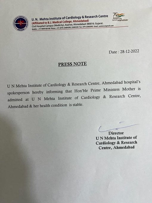 प्रधानमंत्री नरेंद्र मोदी की मां को बुधवार को गुजरात के अहमदाबाद के एक अस्पताल में भर्ती कराया गया। खबरों के मुताबिक, प्रधानमंत्री मोदी की मां हीराबेन मोदी की तबीयत बिगड़ने के बाद उन्हें अहमदाबाद के यूएन मेहता अस्पताल ले जाया गया। पीएम मोदी की मां इस साल 100 साल की हो गईं और उन्हें पहले भी अस्पताल में भर्ती कराया गया था।
