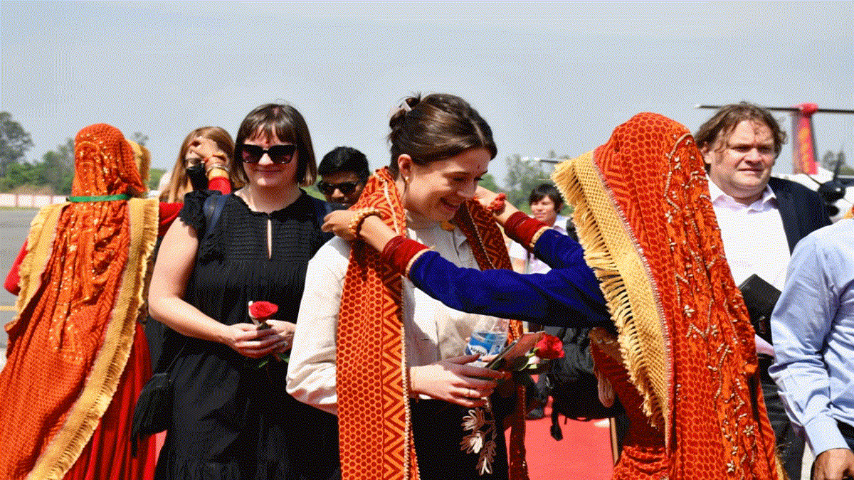 कलाकारों ने उत्तराखंड के प्रसिद्ध कुमाऊंनी लोकगीत बेडु पाको बार मासा—की धुन पर सभी का स्वागत किया। इस दौरान सभी मेहमान भी कलाकारों के साथ खूब थिरके।जानकारी के मुताबिक चार विदेशी मेहमान मेहमान रविवार दोपहर 12:10 बजे की इंडिगो की फ्लाइट से लखनऊ से एयरपोर्ट पर पहुंचे। इसके बाद विस्तारा की फ्लाइट से दोपहर 2:53 बजे आठ डेलीगेट्स आए। वहीं दोपहर 2:59 बजे विस्तारा की अगली फ्लाइट से 22 डेलीगेट्स और शाम सात बजे तीन विदेशी मेहमान एयरपोर्ट पहुंचे।यहां कलाकारों ने तिलक लगाकर और तुलसी की माला पहनाकर सभी का स्वागत किया गया। इस दौरान कलाकारों ने गढ़वालीए कुमांऊनी और जौनसारी नृत्य की प्रस्तुति भी दी।