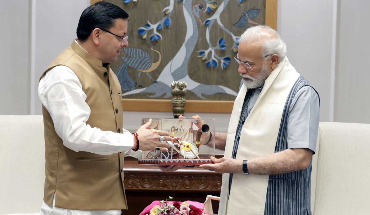 देहरादून : मुख्यमंत्री श्री पुष्कर सिंह धामी ने नई दिल्ली में प्रधानमंत्री श्री नरेन्द्र मोदी से शिष्टाचार भेंट कर उत्तराखंड के विकास में उनके मार्गदर्शन और सहयोग के लिए आभार व्यक्त किया। मुख्यमंत्री ने प्रधानमंत्री को स्थानीय भांग के रेशे की शॉल बेडू के उत्पाद तथा नंदा देवी राजजात की परम्परागत वाद्य यंत्रों ढोल, दमाऊं, रंणसिंघा युक्त प्रतिकृति भी भेंट की।