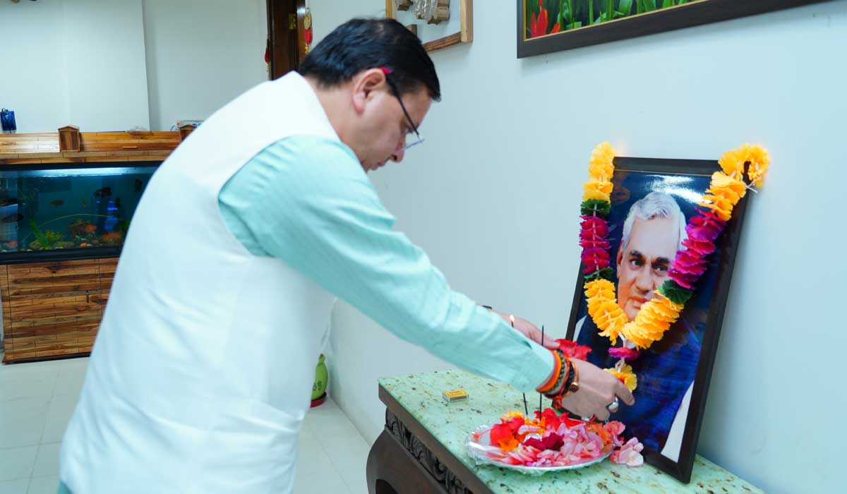 देहरादून: आज पूरा देश अटल बिहारी वाजपेयी को याद कर रहा है। उत्तराखंड में भी पूर्व प्रधानमंत्री की पुण्यतिथि पर उनके अविस्मरणीय योगदान के लिए याद किया जा रहा है। उत्तराखण्ड के मुख्यमंत्री पुष्कर सिंह धामी ने देश के पूर्व प्रधानमंत्री स्वर्गीय अटल बिहारी वाजपेयी को नमन किया। उनकी तस्वीर पर पुष्प चढ़ाते हुए सीएम धामी ने उनके योगदान के लिए धन्यवाद बोला।