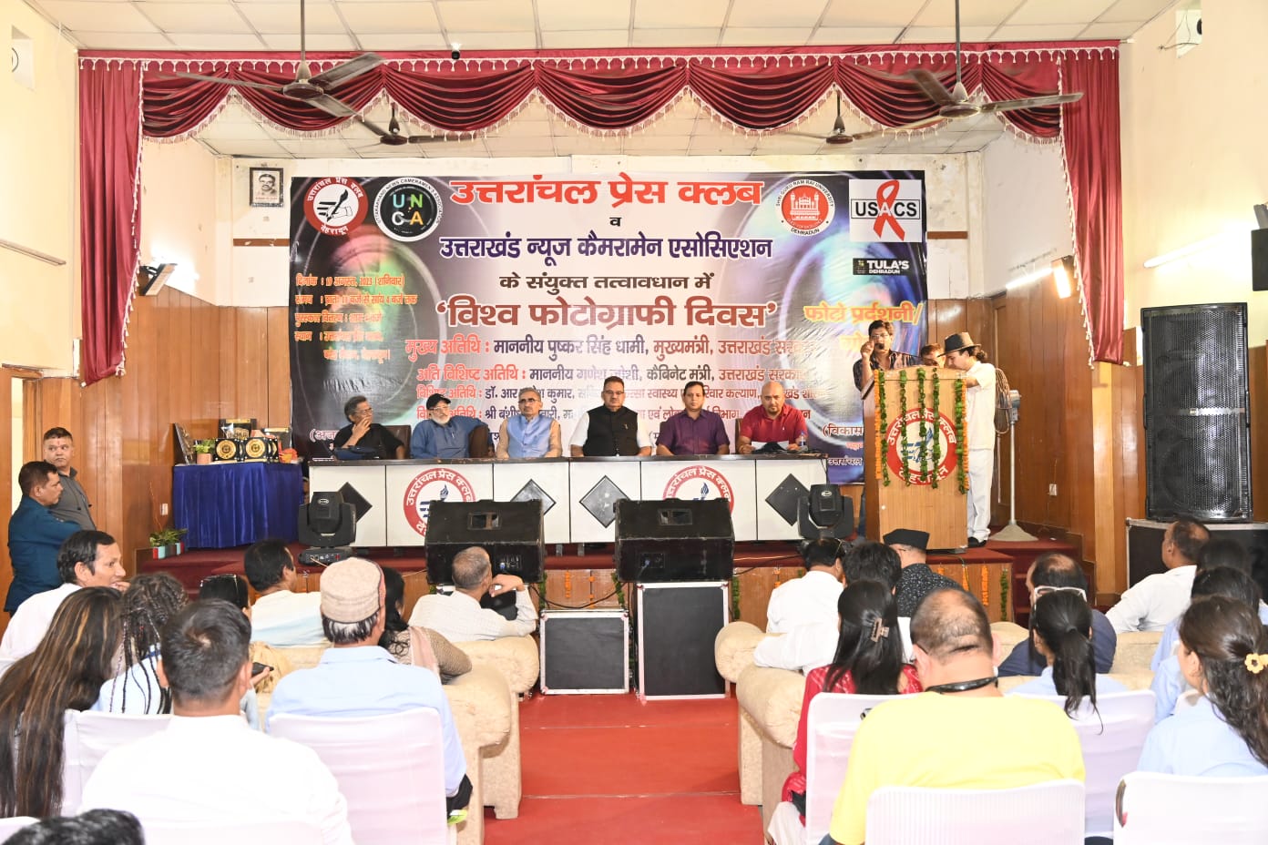 देहरादून : कैबिनेट मंत्री गणेश जोशी ने आज देहरादून परेड ग्राउंड स्थित उत्तरांचल प्रेस क्लब में आयोजित उत्तरांचल प्रेस क्लब एवं उत्तराखण्ड न्यूज कैमरामैन एसोसिएशन के संयुक्त तत्वधान में विश्व फोटोग्राफी दिवस पर आयोजित फोटो एक्जिबिशन एवं कंपीटिशन कार्यक्रम में बतौर मुख्य अतिथि प्रतिभाग किया। इस अवसर पर मंत्री गणेश जोशी ने वरिष्ठ फोटोग्राफरों को सम्मानित भी किया गया। मंत्री गणेश जोशी ने दोनों संस्थाओं के पदाधिकारियों को हार्दिक बधाई एवं शुभकामनाएं भी दी।