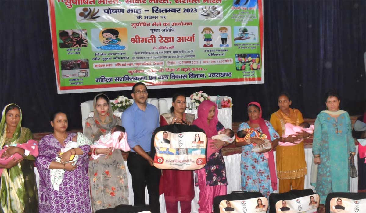 देहरादून : आज प्रदेश की महिला सशक्तिकरण एवं बाल विकास मंत्री रेखा आर्या ने ऑफिसर्स क्लब,यमुना कॉलोनी,देहरादून में राष्ट्रीय पोषण माह के अंतर्गत आयोजित कार्यक्रम में बतौर मुख्य अतिथि शिरकत किया जहां कार्यक्रम का शुभारंभ दीप प्रज्ज्वलन कर किया गया। इस दौरान मंत्री रेखा आर्या ने गर्भवती महिलाओं की गोद भराई कराई और कुपोषित महिलाओं को पोषण किट का वितरण किया।साथ ही लाभान्वित महिलाओं को मुख्यमंत्री महालक्ष्मी किट भी वितरित किए।