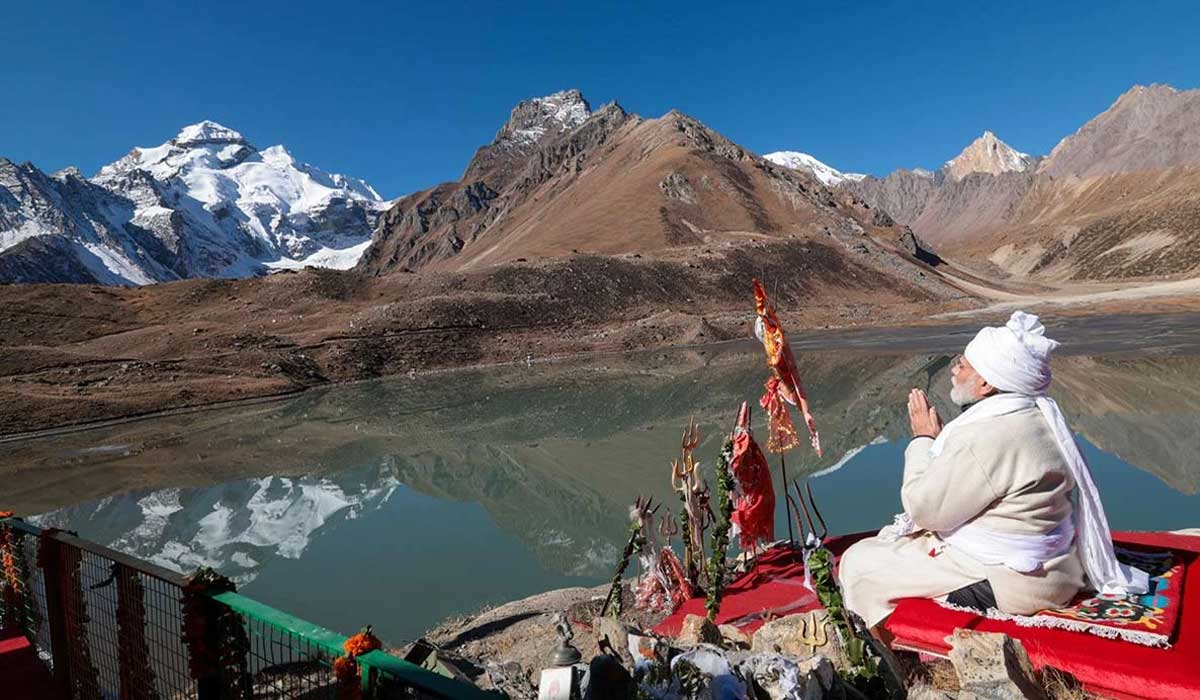 प्रधानमंत्री नरेंद्र मोदी गुरुवार को उत्तराखंड के एक दिवसीय दौरे पर पिथौरागढ़ पहुंचे जहां उन्होंने भगवान शिव के धाम आदि कैलाश चोटी के दर्शन किए और पार्वती कुंड पहुंचकर पूजा-अर्चना की। पारंपरिक पगड़ी और रंगा (शरीर के उपरी हिस्से में पहना जाने वाला वस्त्र) के पारंपरिक परिधान पहने मोदी ने पार्वती कुंड के किनारे स्थित प्राचीन शिव-पार्वती मंदिर में आरती की। स्थानीय पुजारियों वीरेंद्र कुटियाल ओर गोपाल सिंह ने उनकी पूजा संपन्न कराई। प्रधानमंत्री ने आदि कैलाश चोटी के सामने हाथ जोड़कर कुछ देर ध्यान भी लगाया।