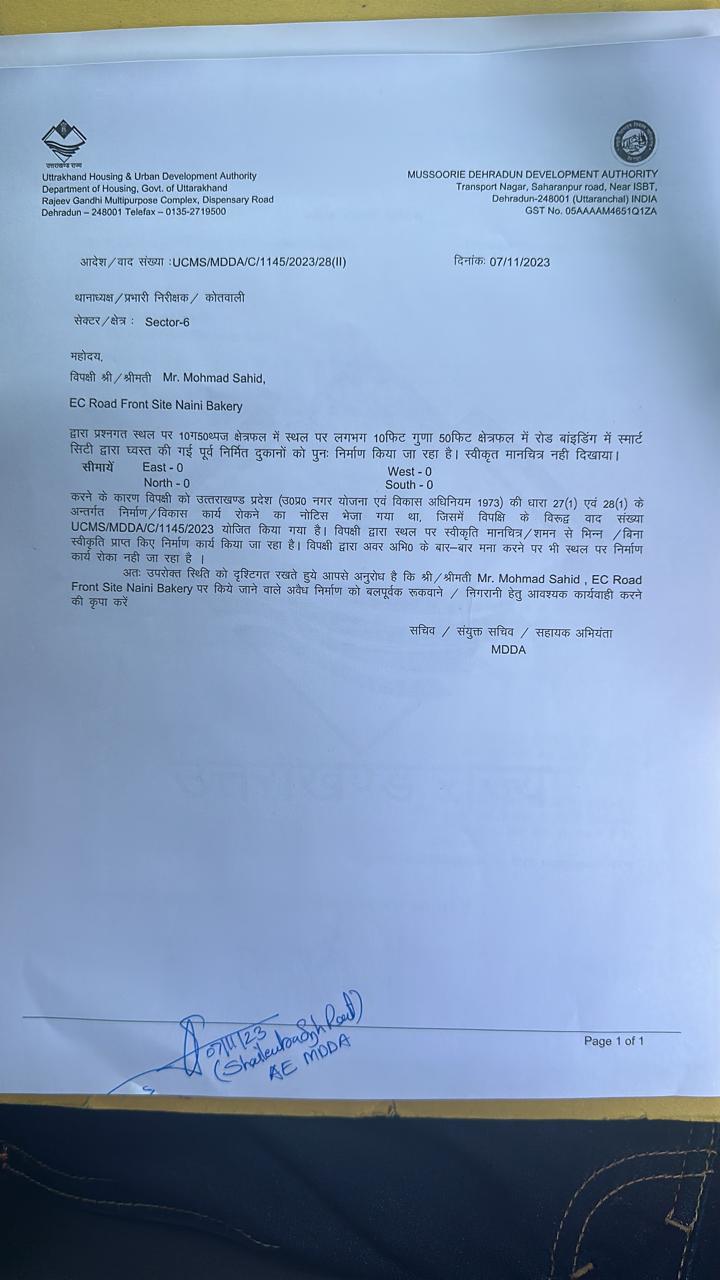 एक दिन पहले मंगलवार को ही एमडीडीए में जब इस संबंध में शिकायत की गई तो देर रात करीब 10 नजे किसी तरह SHO डालनवाला राजेश शाह ने पुलिस टीम भेजकर अवैध निर्माण को रुकवाया था, आरोपी को नोटिस भी मौके पर दिया था, लेकिन फिर से आज आरोपी मोहम्मद शाहिद दुकानों का अवैध निर्माण कर रहा है।