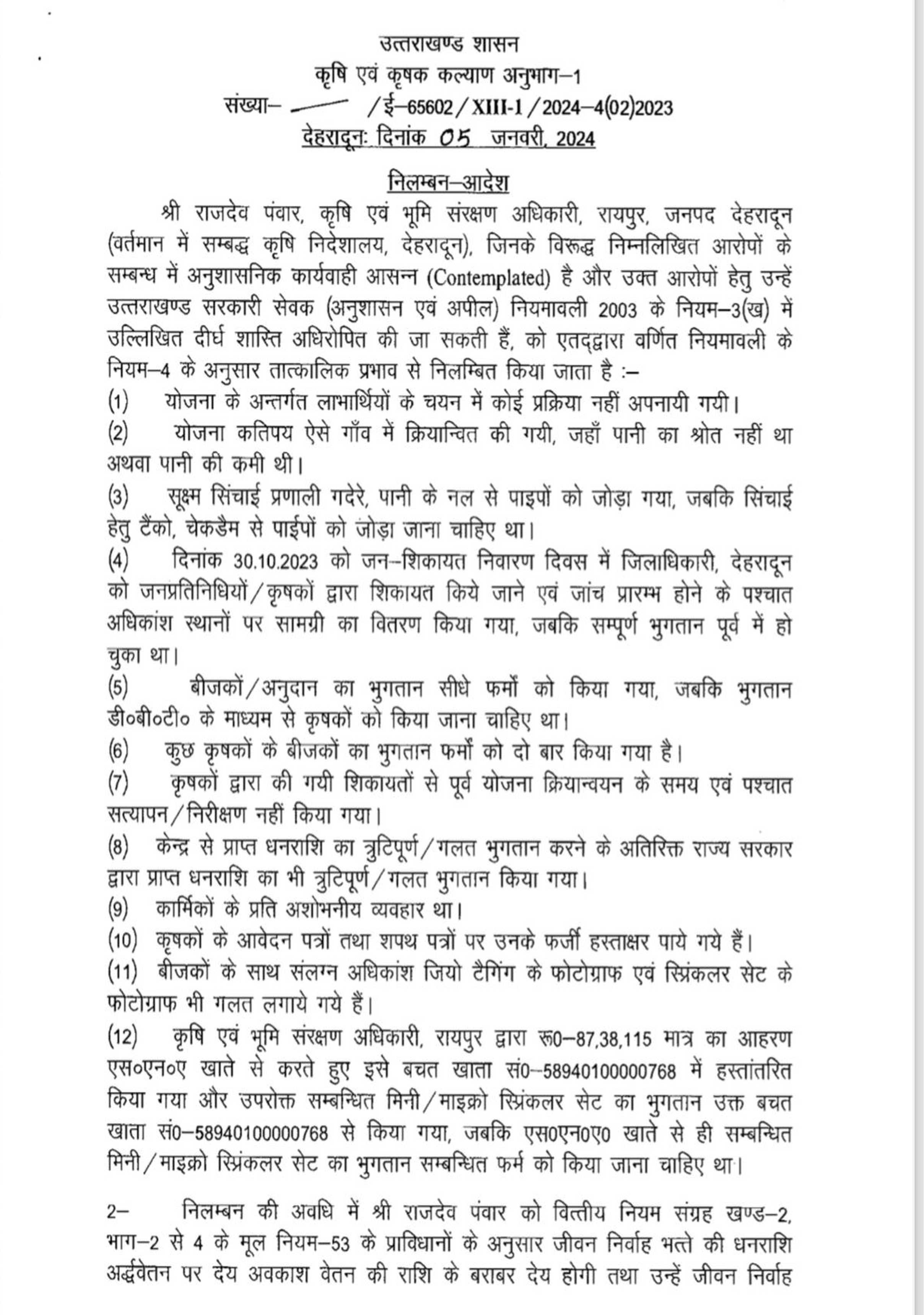 देहरादून : कृषि मंत्री गणेश जोशी ने सचिव कृषि विनोद कुमार सुमन को जनपद देहरादून के रायपुर के कृषि एवं भूमि संरक्षण अधिकारी राजदेव पंवार को प्रधानमंत्री कृषि सिंचाई योजना में बरती गई अनियमितता पर निलंबन के आदेश जारी करने के निर्देश दिए गए। जिसके क्रम में सचिव कृषि ने निलंबन का आदेश भी जारी कर दिया गया।