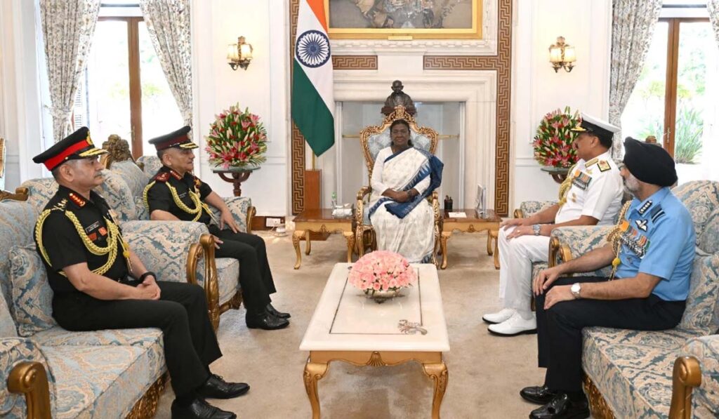 दिल्ली: चीफ ऑफ डिफेंस स्टाफ जनरल अनिल चौहान और तीनों सेनाओं के प्रमुखों ने बुधवार को राष्ट्रपति द्रौपदी मुर्मू से मुलाकात की और उन्हें ऑपरेशन सिंदूर के बारे में जानकारी दी, जिसे भारत ने पहलगाम आतंकी हमले के जवाब में अंजाम दिया था। राष्ट्रपति ने दिल्ली में राष्ट्रपति भवन में सेना के शीर्ष अधिकारियों के साथ अपनी मुलाकात की तस्वीर साझा की। राष्ट्रपति भवन ने तस्वीर के कैप्शन में लिखा कि चीफ ऑफ डिफेंस स्टाफ जनरल अनिल चौहान, थल सेना प्रमुख जनरल उपेंद्र द्विवेदी, वायु सेना प्रमुख एयर चीफ मार्शल एपी सिंह और नौसेना प्रमुख एडमिरल दिनेश के त्रिपाठी ने राष्ट्रपति द्रौपदी मुर्मू से मुलाकात की और उन्हें ऑपरेशन सिंदूर के बारे में जानकारी दी।