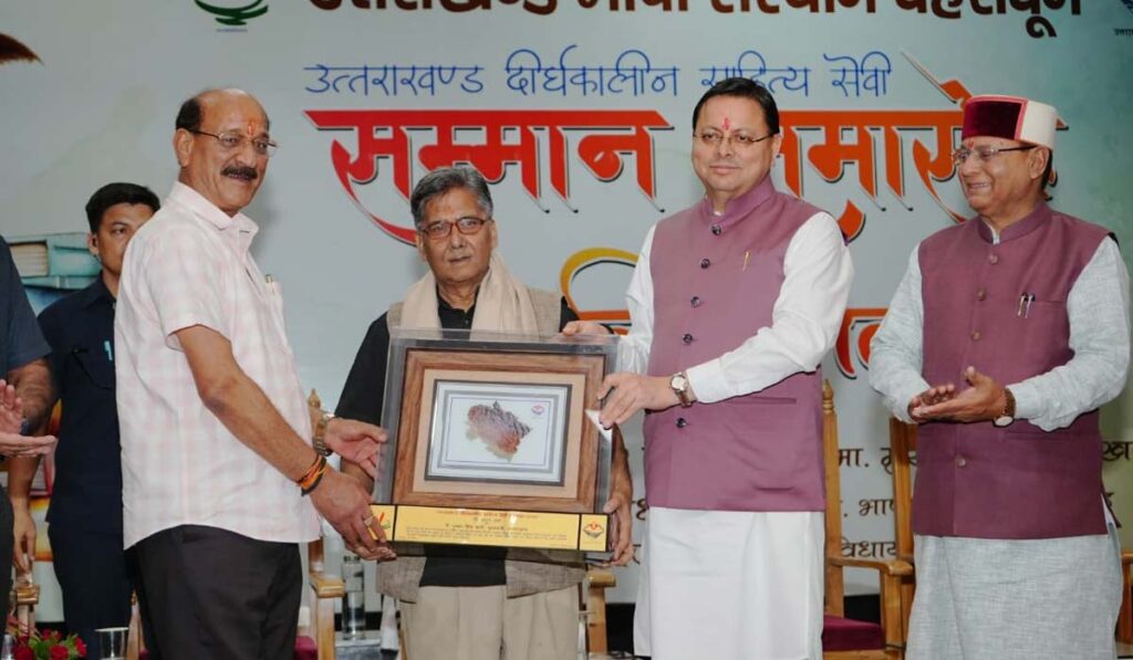 मुख्यमंत्री धामी रविवार को हिंदी दिवस के अवसर पर आईआरडीटी सभागार, सर्वे चौक, देहरादून में आयोजित ‘उत्तराखंड दीर्घकालीन साहित्य सेवी सम्मान समारोह’ में शामिल हुए और साहित्यकारों, कवियों तथा भाषा प्रेमियों को संबोधित किया। इस दौरान साहित्यकार शैलेश मटियानी, गिरीश तिवारी, शेरदा अनपढ़ और हीरा सिंह राणा को मरणोपरांत उत्तराखंड दीर्घकालीन साहित्य सेवी सम्मान 2025 से सम्मानित किया गया। इसके साथ ही सोमवारी लाल उनियाल और अतुल शर्मा को भी सम्मानित किया गया।