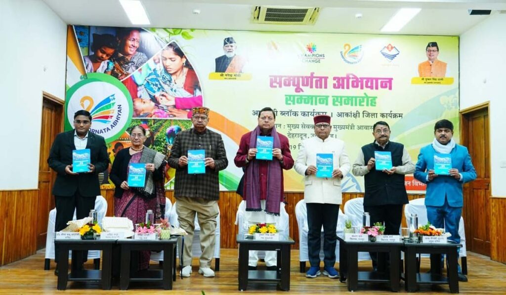देहरादून : मुख्यमंत्री श्री पुष्कर सिंह धामी ने शुक्रवार को मुख्य सेवक सदन, देहरादून में सम्पूर्णता अभियान सम्मान समारोह कार्यक्रम में प्रतिभाग किया। इस अवसर पर मुख्यमंत्री ने नीति आयोग, भारत सरकार द्वारा प्रदत्त प्रशस्ति पत्र एवं पदकों से आकांक्षी जनपद कार्यक्रम एवं आकांक्षी ब्लॉक कार्यक्रम में सर्वश्रेष्ठ प्रदर्शन करने वाले जिलों एवं विकासखंडों को सम्मानित किया। इस अवसर पर मुख्यमंत्री ने Uttarakhand at 25: A Himalayan State With Infinite Possibilities पुस्तक का विमोचन भी किया।
