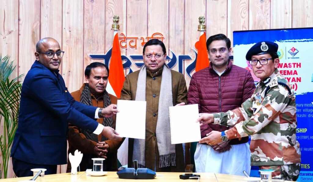 देहरादून : मुख्यमंत्री श्री पुष्कर सिंह धामी की उपस्थिति में आज मुख्यमंत्री आवास में उत्तराखंड शासन एवं भारत–तिब्बत सीमा पुलिस (आईटीबीपी) के मध्य स्वस्थ सीमा अभियान के अंतर्गत एक महत्वपूर्ण समझौता ज्ञापन (MoU) पर हस्ताक्षर किए गए। इस अवसर पर स्वास्थ्य मंत्री डॉ. धन सिंह रावत एवं कैबिनेट मंत्री श्री सौरभ बहुगुणा भी उपस्थित रहे।
