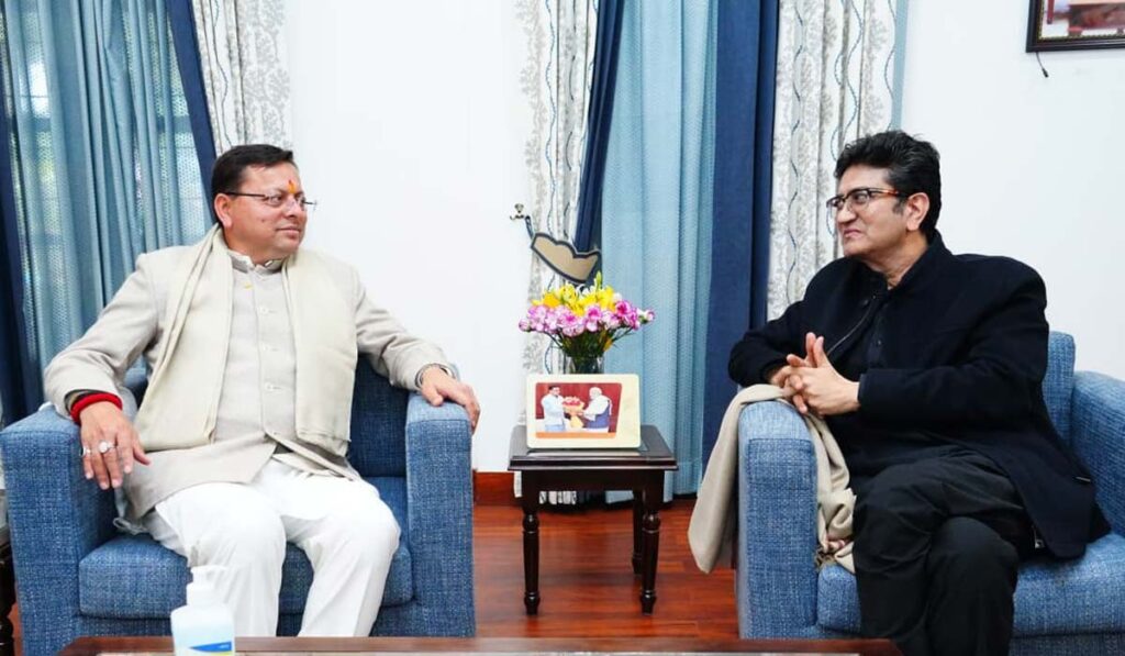 देहरादून : उत्तराखंड के मुख्यमंत्री श्री पुष्कर सिंह धामी से आज मुख्यमंत्री आवास में केंद्रीय फिल्म प्रमाणन बोर्ड (सीबीएफसी) के अध्यक्ष, प्रख्यात लेखक, कवि एवं गीतकार श्री प्रसून जोशी ने शिष्टाचार भेंट की।