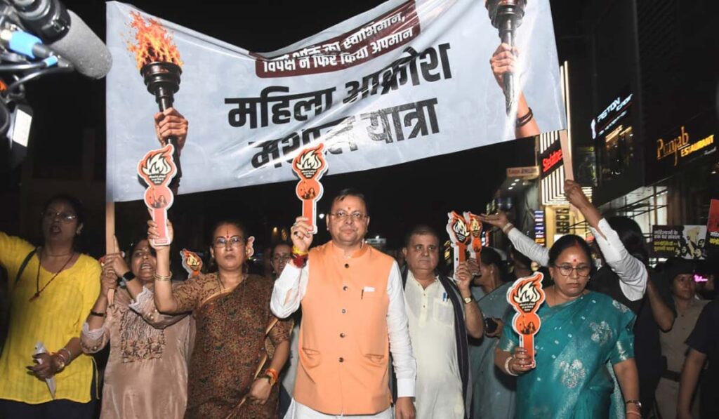 देहरादून : महिला आरक्षण के मुद्दे को लेकर मातृशक्ति नें देहरादून में गांधी पार्क से घंटाघर तक महिला आक्रोश मशाल यात्रा निकाली। इस यात्रा में मुख्यमंत्री पुष्कर सिंह धामी और मंत्री रेखा आर्या सहित बड़ी संख्या में पार्टी पदाधिकारी और महिलाएं शामिल रहीं।